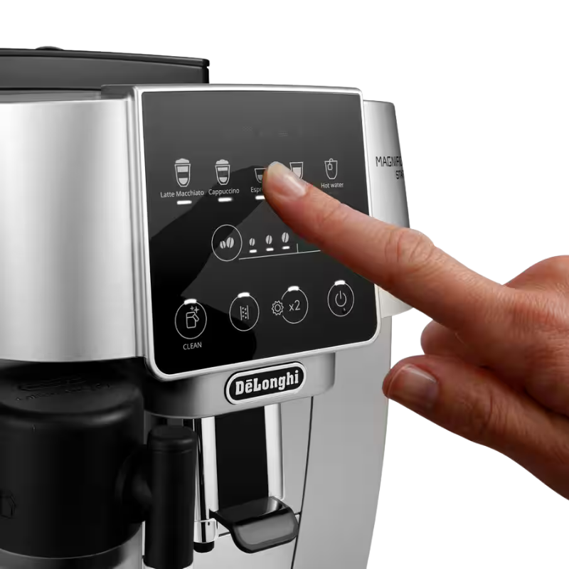 La Magnifica Start prepara varias bebidas espresso con un solo toque, incluyendo Espresso, Café, Cappuccino y Latte Macchiato, y también sirve agua caliente para té o infusiones.